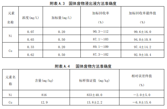 六家實(shí)驗(yàn)室采用電熱板法對(duì)含鎳、銅的實(shí)際固體廢物浸出液加標(biāo)樣品進(jìn)行了測(cè)試,加標(biāo)回收率范圍分別為:87.1%~112%,87.3%~109%。