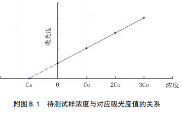 分別量取4等份量待測(cè)試樣(濃度為Cx),配制總體積相同的4份溶液。第一份不加標(biāo)準(zhǔn)溶液,第二、三、四份分別按比例加入不同濃度的標(biāo)準(zhǔn)溶液,4份溶液的濃度分別為:Cx、Cx+Co、Cx+2Co、Cx+3Co,加入標(biāo)準(zhǔn)的最小濃度Co≈0.5Cx。用空白溶液調(diào)零,在相同條件下依次測(cè)定4份溶液的吸光度值。以吸光度值為縱坐標(biāo),加入標(biāo)準(zhǔn)溶液的濃度為橫坐標(biāo),繪制校準(zhǔn)曲線,曲線反向延伸與橫坐標(biāo)的交點(diǎn)即為待測(cè)樣品的濃度。該方法只適用于濃度和吸光值呈線性的區(qū)域。待測(cè)試樣濃度與對(duì)應(yīng)吸光度值的關(guān)系見(jiàn)附圖A.1。