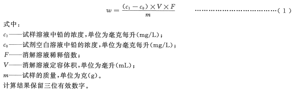 試樣中總鉛含量以鉛元素的質(zhì)量分數(shù)ω計,數(shù)值以毫克每千克(mg/kg)表示,按式(1)計算