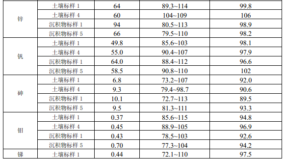 11.4 每批次樣品至少分析10%的加標回收樣,樣品數(shù)量小于10個時,應(yīng)至少做一個加標回收樣。加標回收樣測定結(jié)果中,電熱板消解測定鎘(Cd)、鈷(Co)、銅(Cu)、鉻(Cr)、錳(Mn)、鎳(Ni)、鉛(Pb)、鋅(Zn)、釩(V)、砷(As)的加標回收率應(yīng)控制在70%~125%之間,鉬(Mo)、銻(Sb)的加標回收率應(yīng)控制在50% ~125%之間;微波消解測定12種金屬元素的加標回收率應(yīng)控制在70%~125%之間。