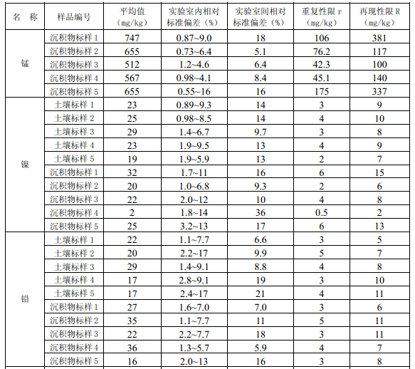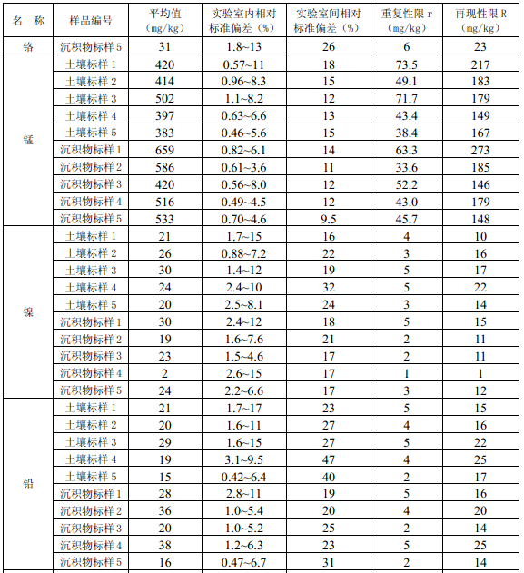11.3 每批次樣品至少按10%的比例進行平行雙樣測定,樣品數(shù)量少于10個時,應(yīng)至少測定一個平行雙樣。平行雙樣測定結(jié)果中,電熱板消解測定鈷(Co)、銅(Cu)、鉻(Cr)、錳(Mn)、鎳(Ni)、鉛(Pb)、鋅(Zn)、釩(V)、砷(As)的相對偏差應(yīng)小于30%,鎘(Cd)、鉬(Mo)、銻(Sb)的相對偏差應(yīng)小于40%;微波消解測定12種金屬元素的相對偏差應(yīng)小于30%。