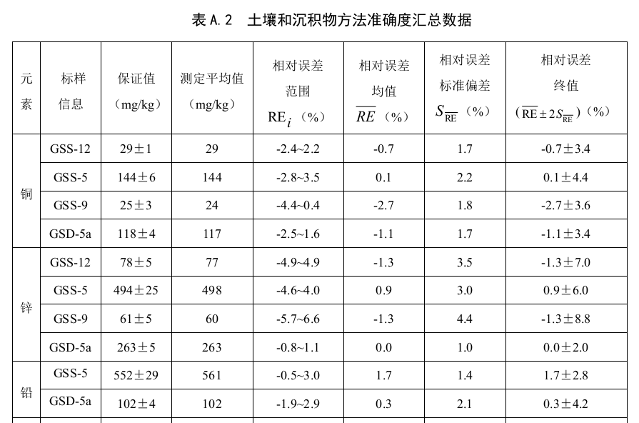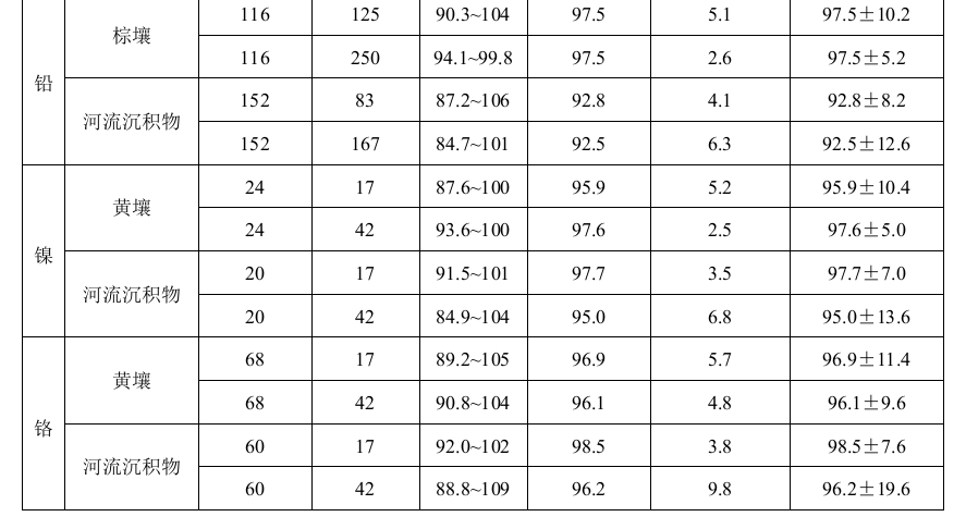 本標準適用于土壤和沉積物中銅、鋅、鉛、鎳和鉻的測定。當(dāng)取樣量為0.2g、消解后定容體積為25 ml時,銅、鋅、鉛、鎳和鉻的方法檢出限分別為1 mg/kg、1 mg/kg、10 mg/kg、3 mg/kg和4 mg/kg,測定下限分別為4 mg/kg、4 mg/kg、 40 mg/kg、12 mg/kg和16 mg/kg。