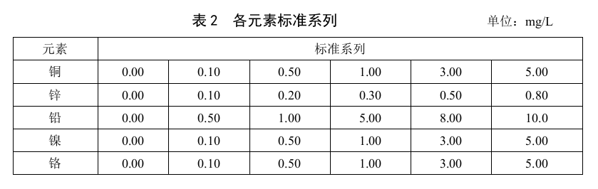 注:測定鉻時,應(yīng)調(diào)節(jié)燃燒器高度,使光斑通過火焰的亮藍色部分。 8.2 標準曲線的建立 取100 ml容量瓶,按表2用硝酸溶液(5.12)分別稀釋各元素標準使用液(5.18~5.22),配制成標準系列。 按照儀器測量條件(8.1),用標準曲線零濃度點調(diào)節(jié)儀器零點,由低濃度到高濃度依次測定標準系列的吸光度,以各元素標準系列質(zhì)量濃度為橫坐標,相應(yīng)的吸光度為縱坐標,建立標準曲線。