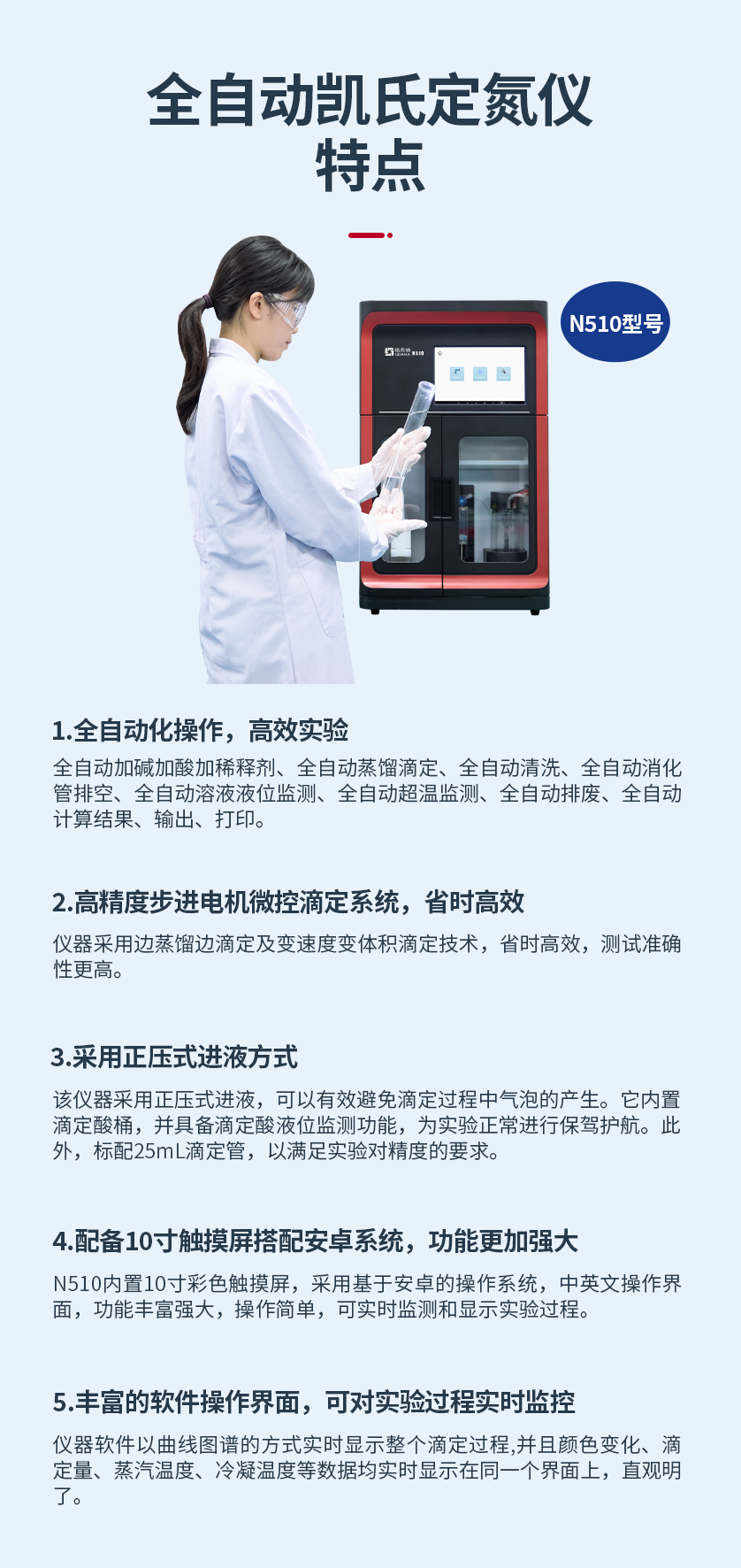 全自動(dòng)加堿加酸加稀釋劑、全自動(dòng)蒸餾滴定、全自動(dòng)清洗、全自動(dòng)消化管排空、全自動(dòng)溶液液位監(jiān)測(cè)、全自動(dòng)超溫監(jiān)測(cè)、全自動(dòng)排廢、全自動(dòng)計(jì)算結(jié)果、輸出、打印。