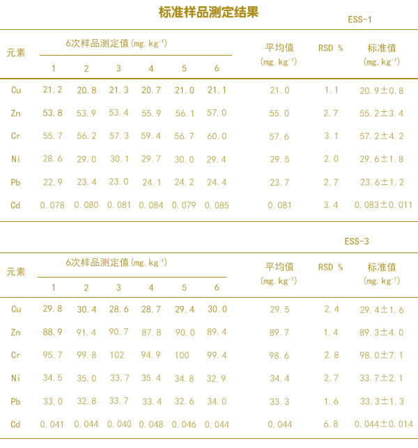 分別準(zhǔn)確稱取ESS一1和ESS一3標(biāo)準(zhǔn)土壤樣品各6份,標(biāo)準(zhǔn)樣品轉(zhuǎn)移至石墨消解儀樣品管中,放進(jìn)相應(yīng)的樣品位置,統(tǒng)一測(cè)定消解液中6種重金屬元素的含量,測(cè)定結(jié)果如上面的表格。結(jié)果得出2個(gè)土壤標(biāo)準(zhǔn)樣品中的6種重金屬元素測(cè)定值均在不確定度范圍內(nèi),且相對(duì)標(biāo)準(zhǔn)偏差均小于7%。