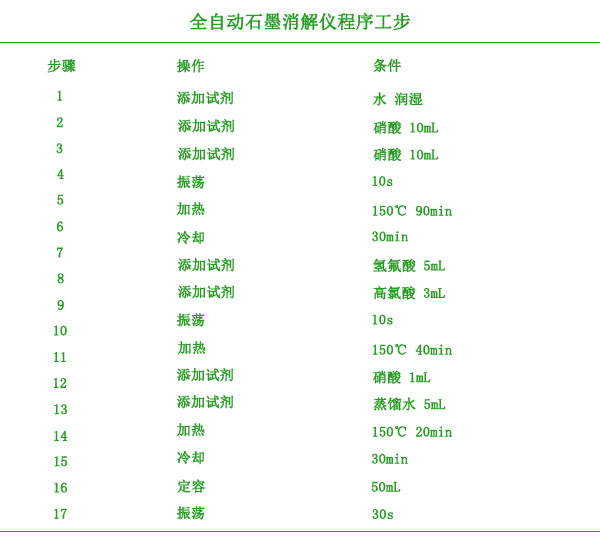 準(zhǔn)確稱取0.5g(精確至0.0001g)試樣于全自動(dòng)石墨消解儀特氟龍消解管內(nèi),并置放到全自動(dòng)消解儀石墨孔中,進(jìn)行編號(hào)。用少量水潤(rùn)濕后,加入硝酸和鹽酸各10mL,振搖10s,在150℃溫度下加熱90min;冷卻30min后,加入5mL氫氟酸和3mL高氯酸,振搖10s,在150℃溫度下加熱40min;再加入1mL硝酸和5mL蒸餾水,在150℃溫度下繼續(xù)加熱20min;冷卻30min,用蒸餾水定容至50mL,振搖30s。全自動(dòng)石墨消解儀程序消解步驟如下:
