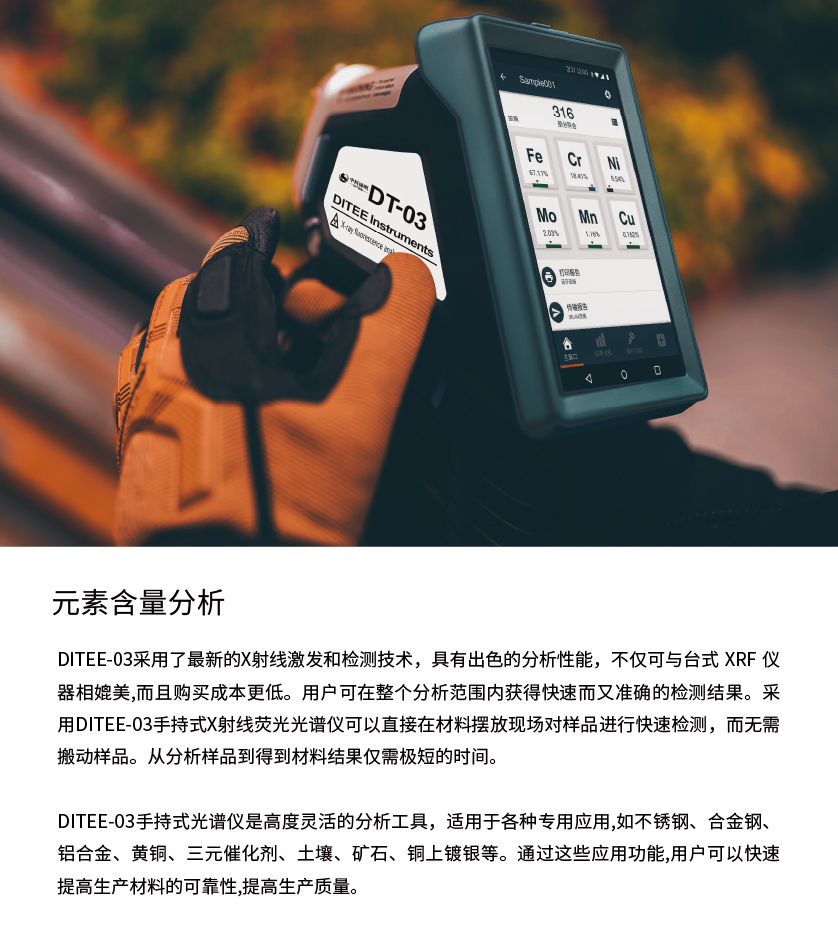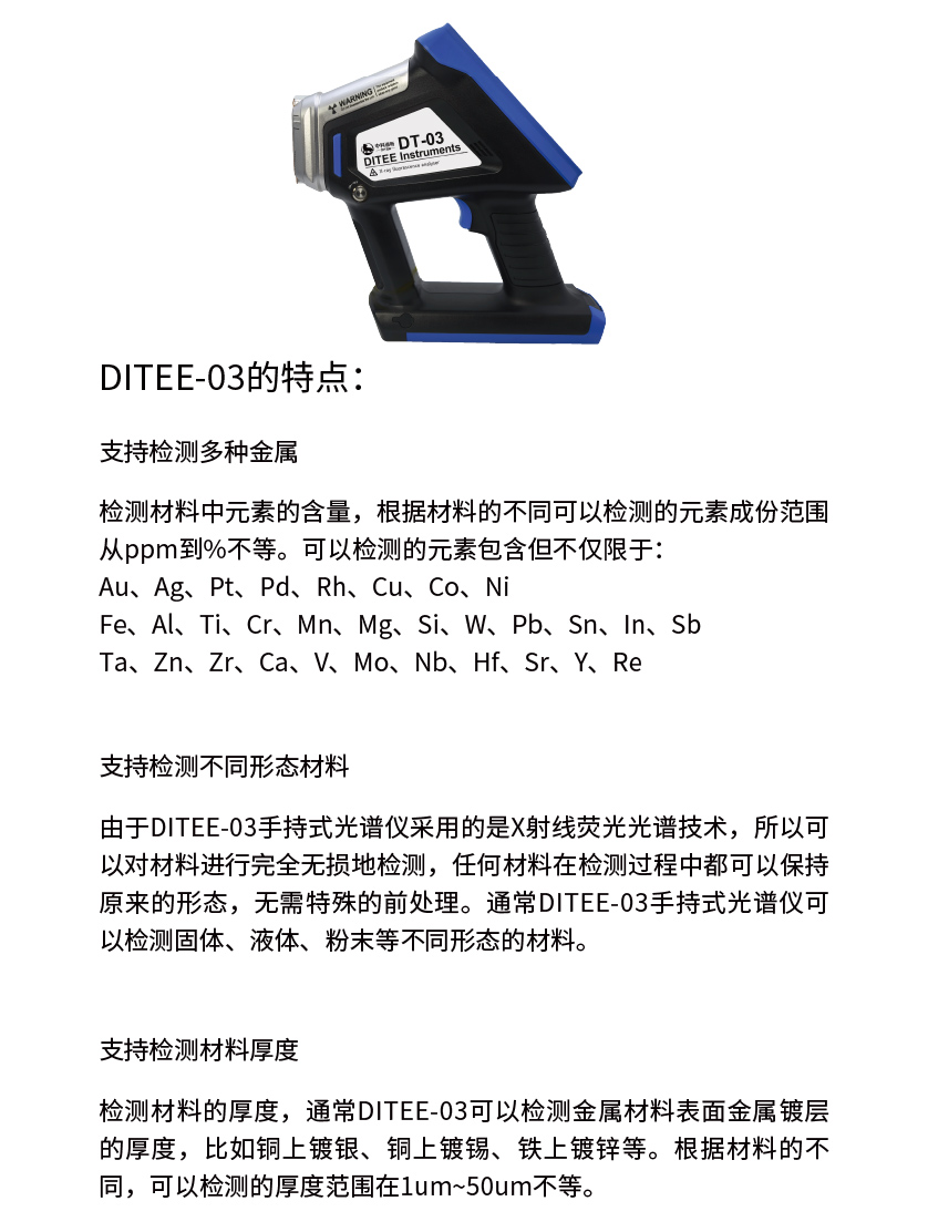 由于DITEE-03手持式光譜儀采用的是X射線熒光光譜技術(shù),所以可以對(duì)材料進(jìn)行完全無(wú)損地檢測(cè),任何材料在檢測(cè)過(guò)程中都可以保持原來(lái)的形態(tài),無(wú)需特殊的前處理。通常DITEE-03手持式光譜儀可以檢測(cè)固體、液體、粉末等不同形態(tài)的材料。