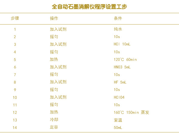由于測(cè)定Cu,Zn,Pb,Cd,Cr,Ni等6種重金屬采用統(tǒng)一的消解液,本次試驗(yàn)使用HCl—HNO3一HF—HClO4混合酸消解體系,將土壤中的晶格全部打開,進(jìn)行全消解。因用酸量較少,只需準(zhǔn)確稱取0.2000g左右干燥土壤樣品至消解管中,設(shè)置系統(tǒng)自動(dòng)加酸。就可進(jìn)行消解。全自動(dòng)石墨消解系統(tǒng)的消解程序設(shè)置如下表格。儀器自動(dòng)定容至50mL,每批樣品加做雙份全程序空白。