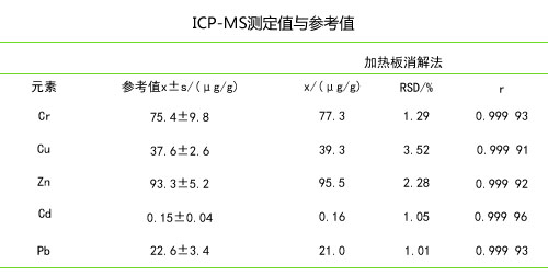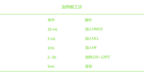 加熱板消解:稱取0.1000g標(biāo)準(zhǔn)土壤樣 品(各3個平行樣)于洗凈的聚四氟乙烯燒杯中,再加 步驟 入10 mL HNO3、3 mL HCL和 1mL HF,置于加熱 板上保持110~120℃恒溫加熱2~3h,趕酸至近干,用2% HNO3 將消解液定容于5mL,離心,等測;此外在土壤樣品 消解的同時,相同的試驗(yàn)溫度、時間條件下再做3個試劑空白,以消除由于試劑帶來的誤差。