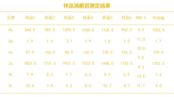 樣品消解后測(cè)定結(jié)果表