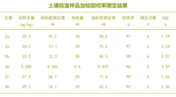 采用實(shí)驗(yàn)室電熱板消解土壤標(biāo)準(zhǔn)樣品ESS-1結(jié)果可以看出,測定結(jié)果與標(biāo)準(zhǔn)樣品的推薦值較吻合,說明其準(zhǔn)確度高、結(jié)果可靠;多元素的加標(biāo)回收率在95%~98%之間,符合土壤重金屬含量分析的質(zhì)量要求。