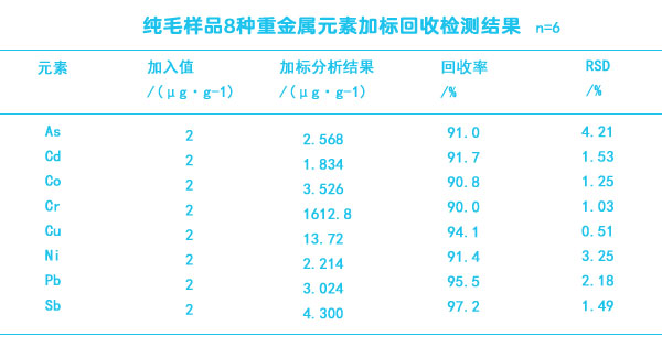為了驗(yàn)證實(shí)驗(yàn)結(jié)果的可靠性,在準(zhǔn)確測(cè)定純毛樣品中8種重金屬元素的基礎(chǔ)上,進(jìn)行加標(biāo)回收實(shí)驗(yàn)。實(shí)驗(yàn)檢測(cè)結(jié)果如下表: