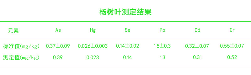 對國家標(biāo)準(zhǔn)物質(zhì)楊樹葉按以上實驗電熱板濕化消解的方法處理后,按上述分析條件分別進(jìn)行多次檢測,并用一次消解進(jìn)行多種重金屬檢測共7次的結(jié)果。