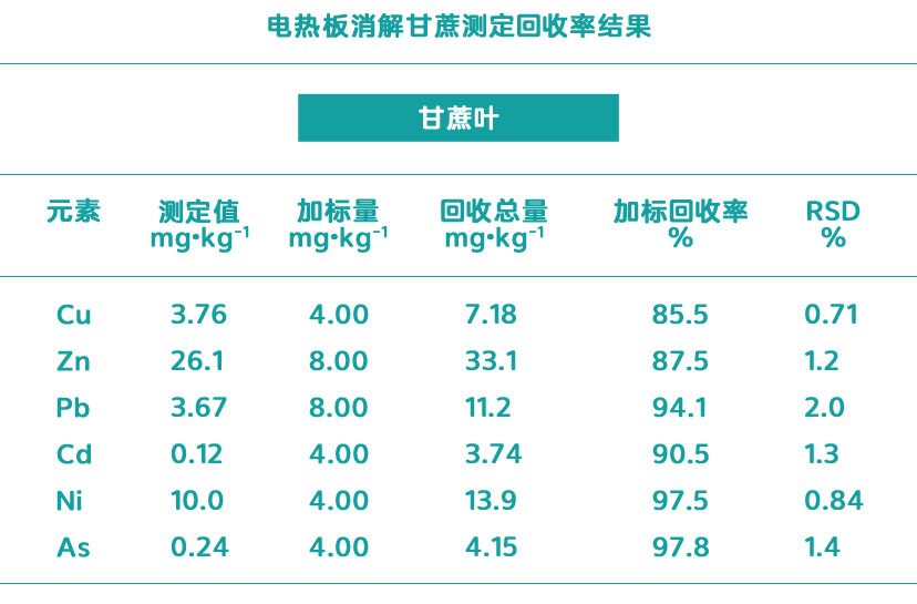 將某地甘蔗產(chǎn)區(qū)甘蔗葉和甘蔗渣樣品經(jīng)過電熱板消解后進(jìn)行測定,并完成加標(biāo)回收試驗(yàn),測定結(jié)果分別見表“電熱板消解甘蔗回收率測定結(jié)果-甘蔗葉”及“電熱板消解甘蔗回收率測定結(jié)果-甘蔗渣”。