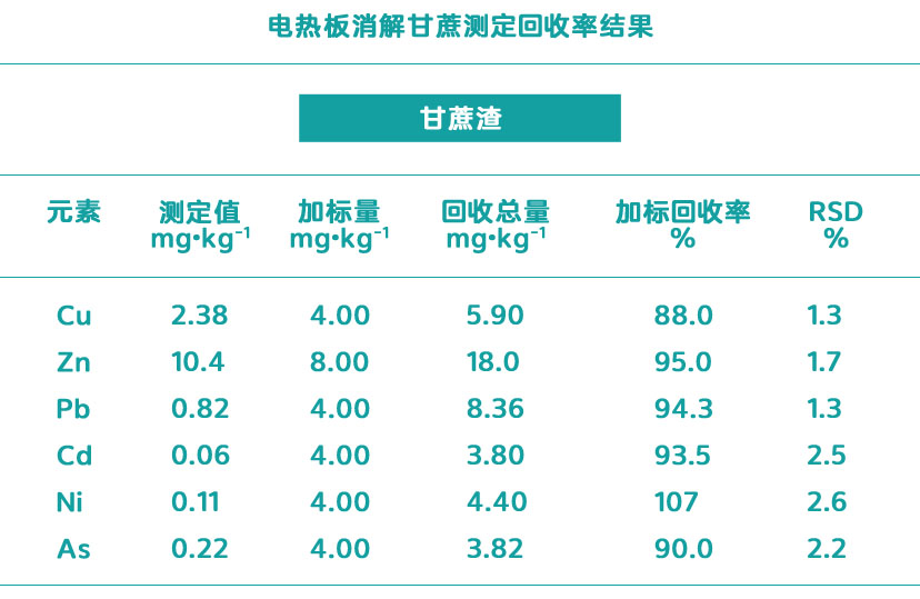 由兩表樣品測定的結(jié)果可得,加標(biāo)回收率在83.8%—108%之間,電熱板消解甘蔗葉及甘蔗渣的實(shí)驗(yàn)結(jié)果準(zhǔn)確可靠。