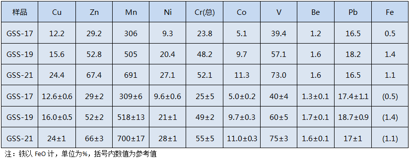 用HCl+HNO3+HF+HC104四酸全消解體系通過(guò)陶瓷電熱板濕法消解土壤樣品,進(jìn)行3種不同加酸過(guò)程對(duì)GSS-17、GSS-19和GSS-21標(biāo)準(zhǔn)土壤樣品進(jìn)行3次平行預(yù)處理,測(cè)定土壤中銅、鋅、錳、鎳、總鉻、鉆、釩、鈹、鉛、鐵l0種重金屬元素,結(jié)果如下表所示。