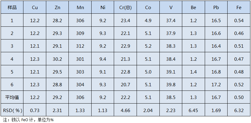 從上表結(jié)果得出,各元素的相對(duì)標(biāo)準(zhǔn)偏差在0.73%~6.45%之間,符合實(shí)驗(yàn)室要求,方法適用于環(huán)境樣品預(yù)處理。